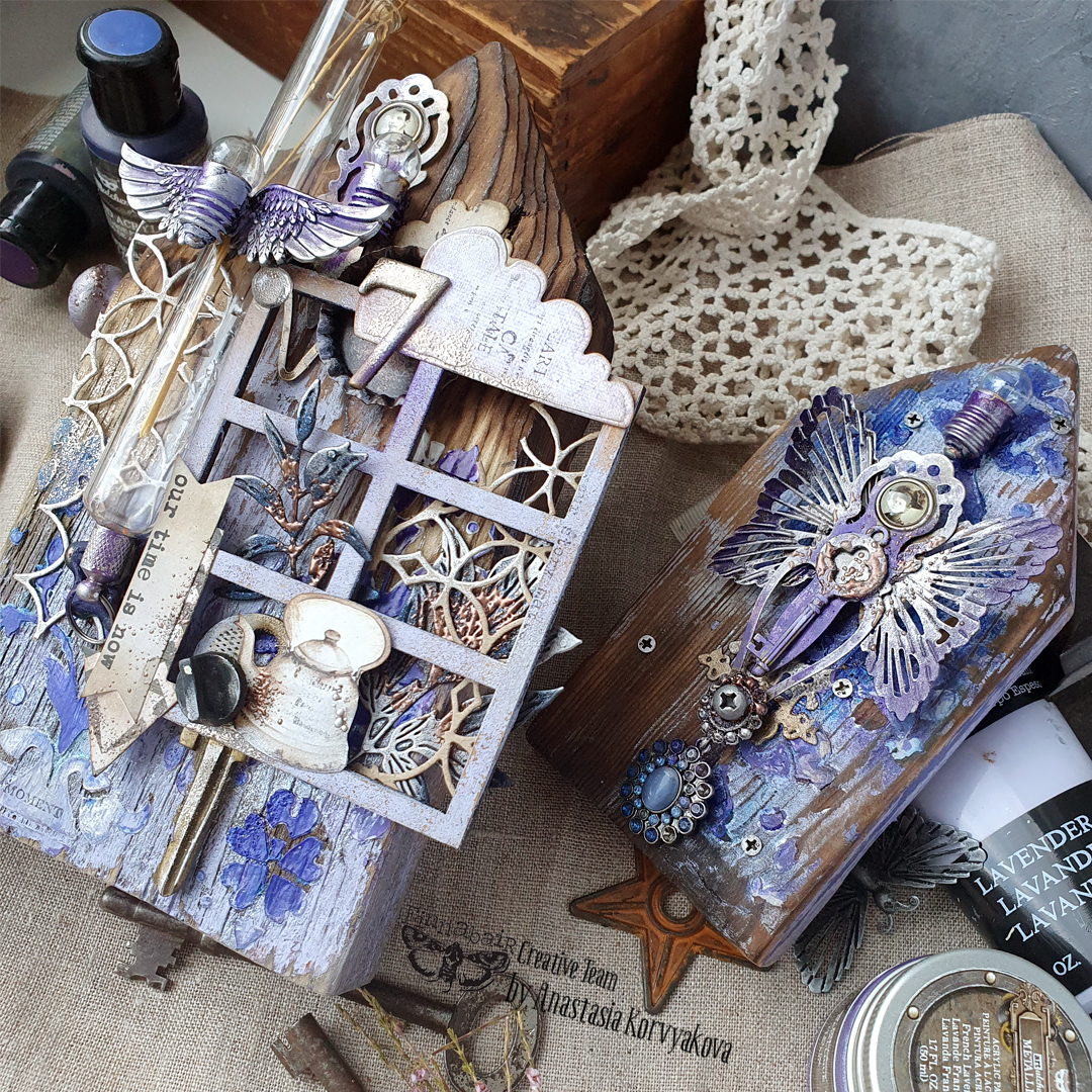 Часть деталей я покрыла смесью жидкой Purple и импасто Lavender, после добавила воск Old Silver. Кое-где добавила пудры для эмбоссинга Ranger - Hammered.