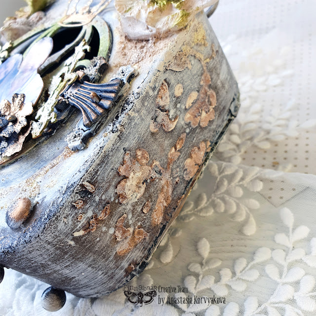 This alteration turned out with a small secret place, because I decided to make a chipboard door. I don't know what my friends can keep in this place... maybe some small love notes? ..I've used various Finnabair material, more details watch in video tutorial, at the end of the post.
